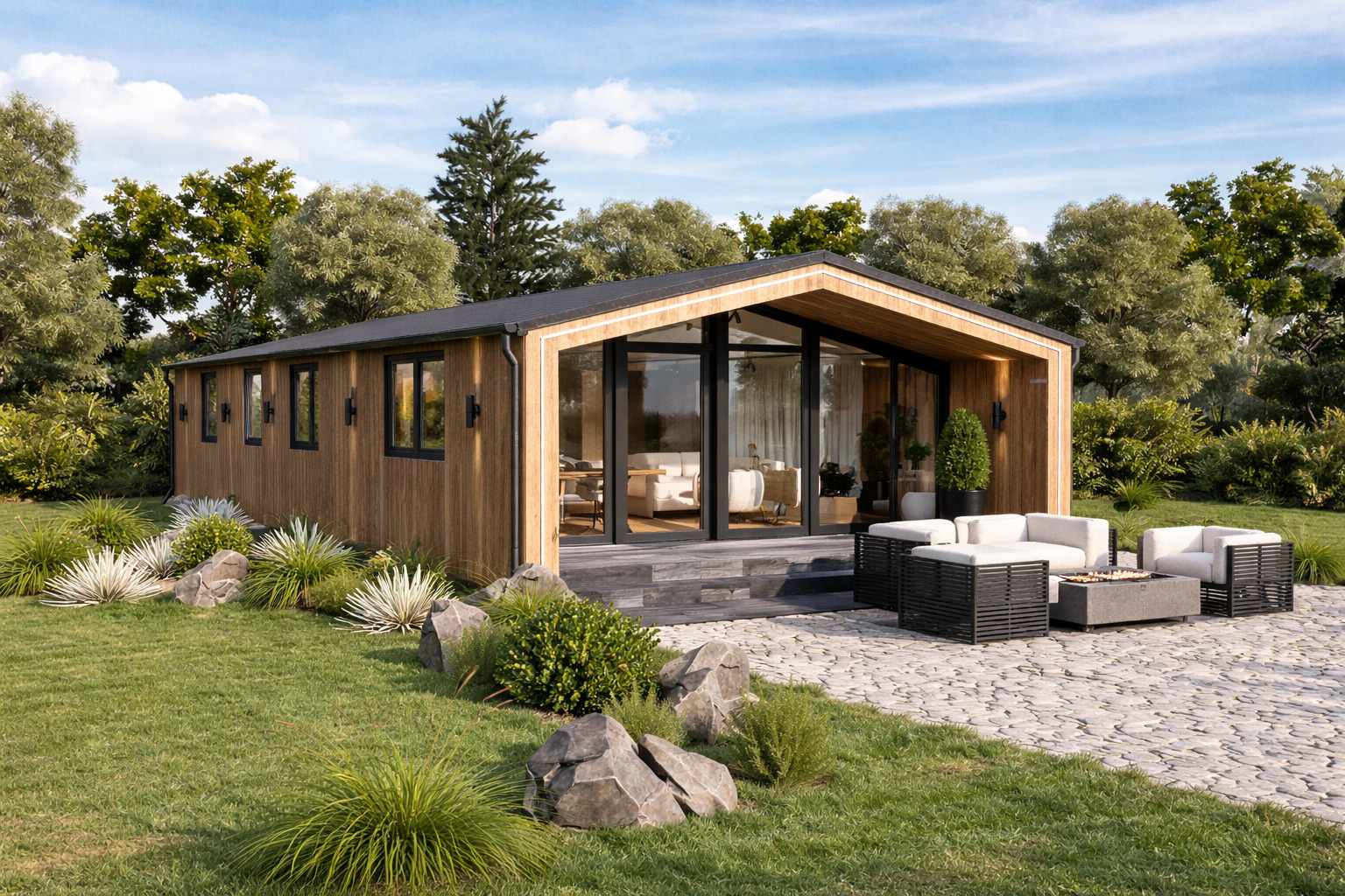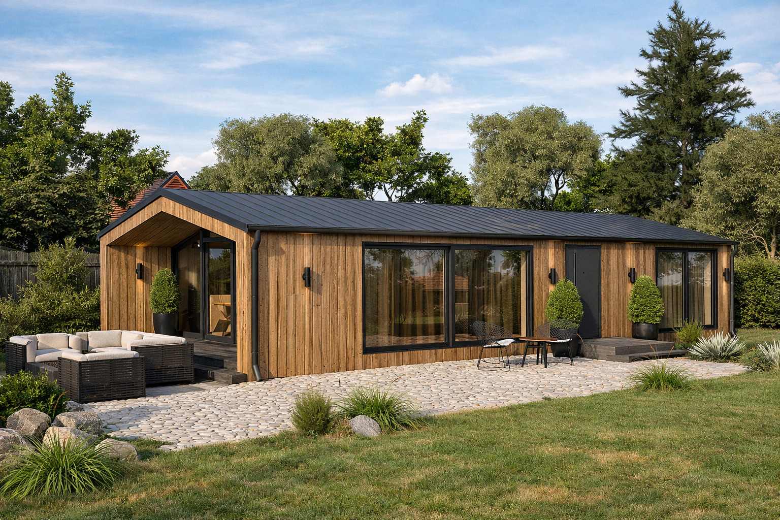 Chalet 60 ist die ideale Wahl für diejenigen, die ein funktionales, elegantes und gemütliches Zuhause suchen. Der geräumige Wohnbereich und die durchdachte Raumaufteilung sorgen für ein harmonisches Gefühl von Gemütlichkeit. Hochwertige Verarbeitung rundet das Bild ab und macht dieses Haus zu einer einzigartigen Wohnlösung.