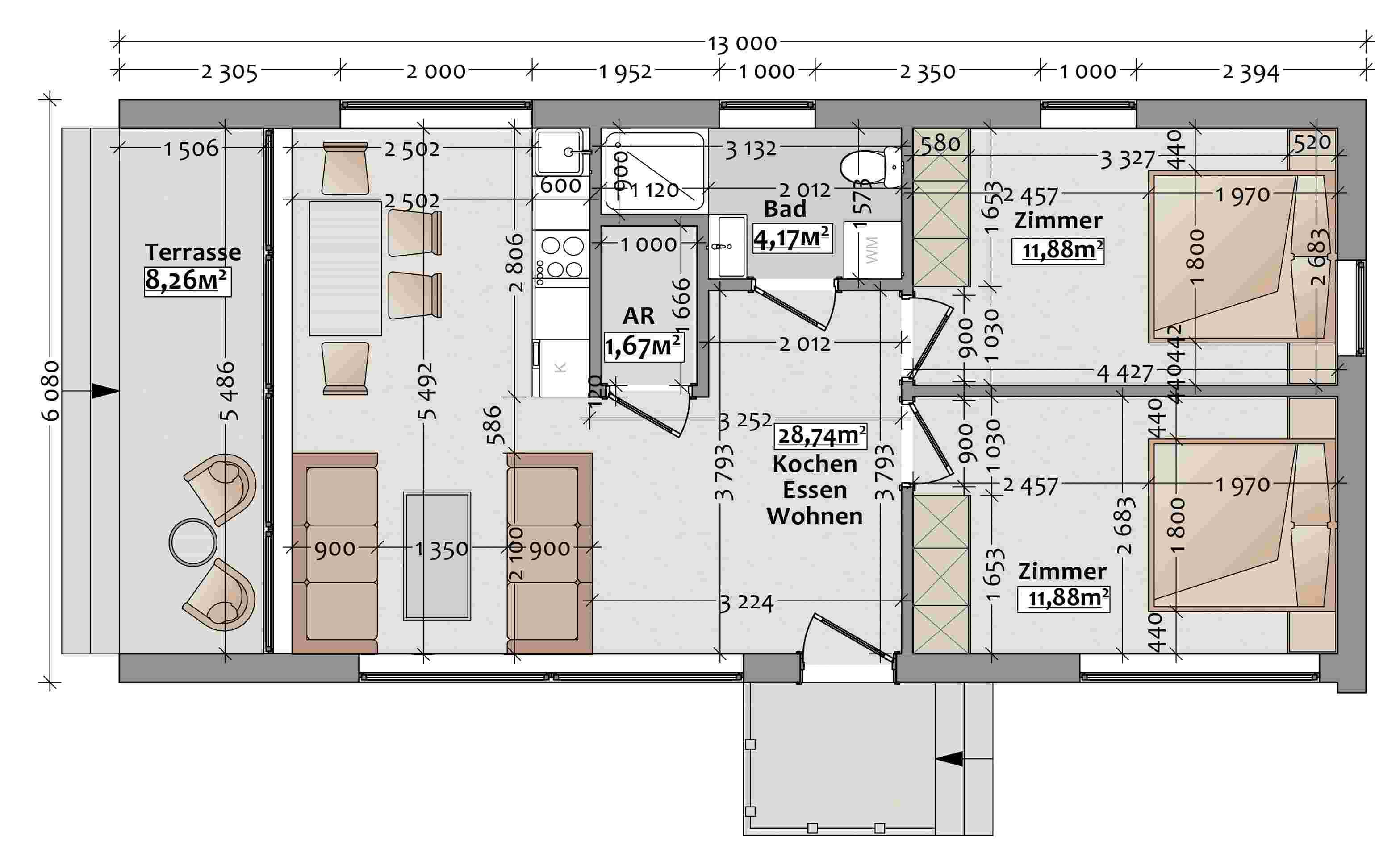 2 x Schlafraum, Bad/WC, Küche/ Wohnzimmer,