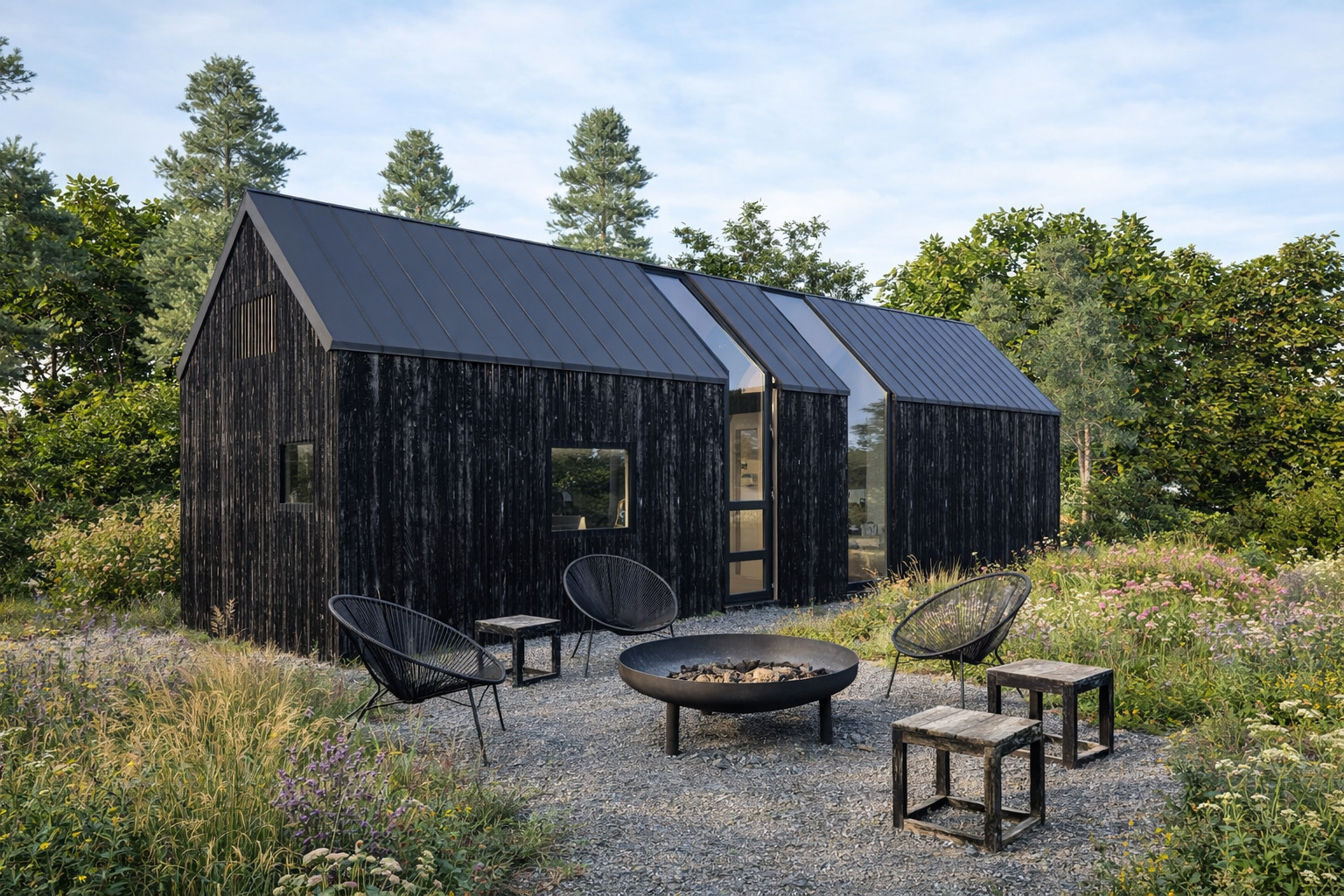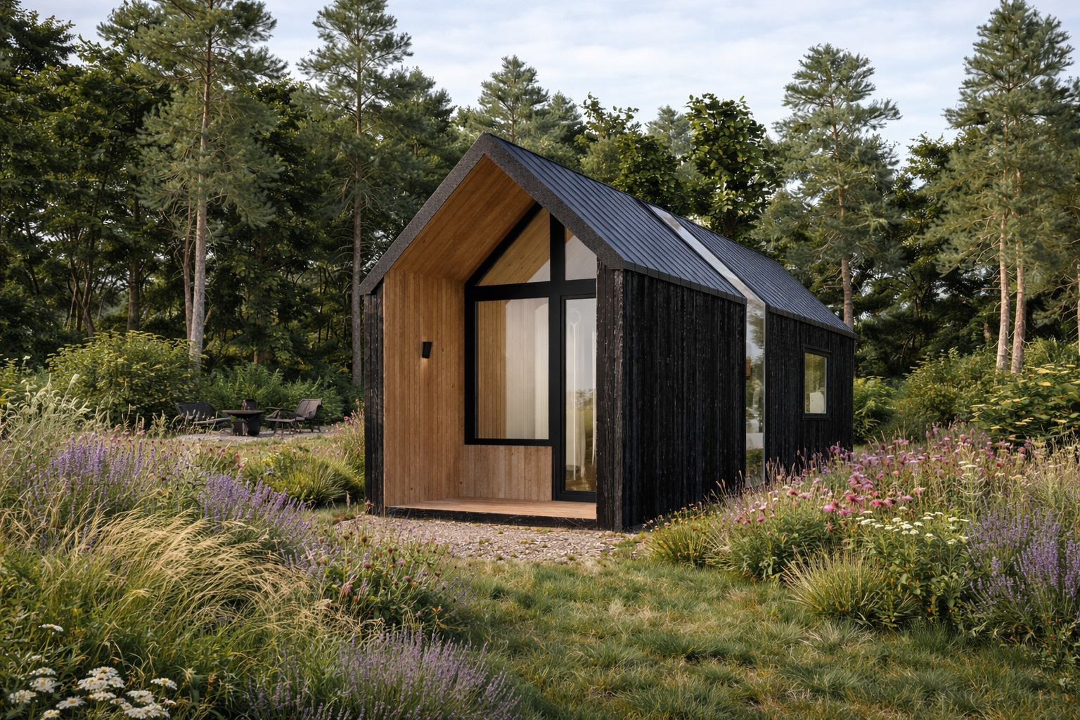 - Fassade: Aus Naturholz, beschichtet mit wasserabweisendem Lack, der die Konstruktion schützt und ihre Ästhetik bewahrt.