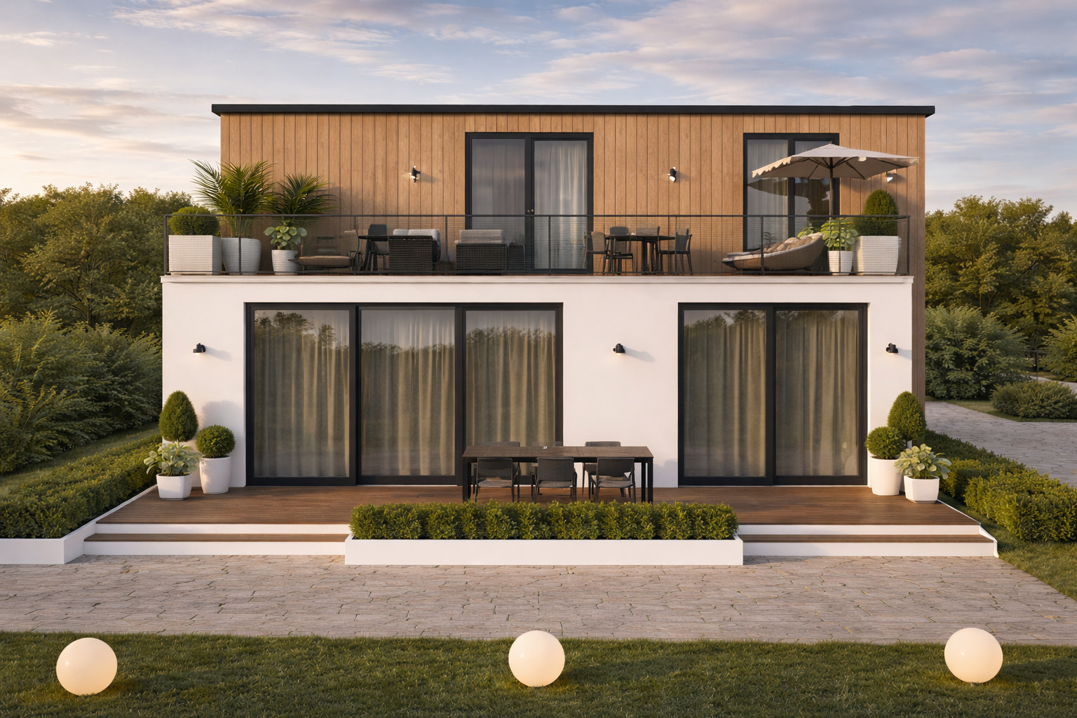 Scala 121 steht für intelligente Architektur und eine optimale Raumnutzung. Die Kombination aus großen Fensterflächen, hochwertigen Materialien und modernen Lösungen macht dieses zweigeschossige Haus zur idealen Wahl für Familien und Paare. Helle und geräumige Räume schaffen eine gemütliche Atmosphäre, während die durchdachte Planung viele praktische Details bietet.