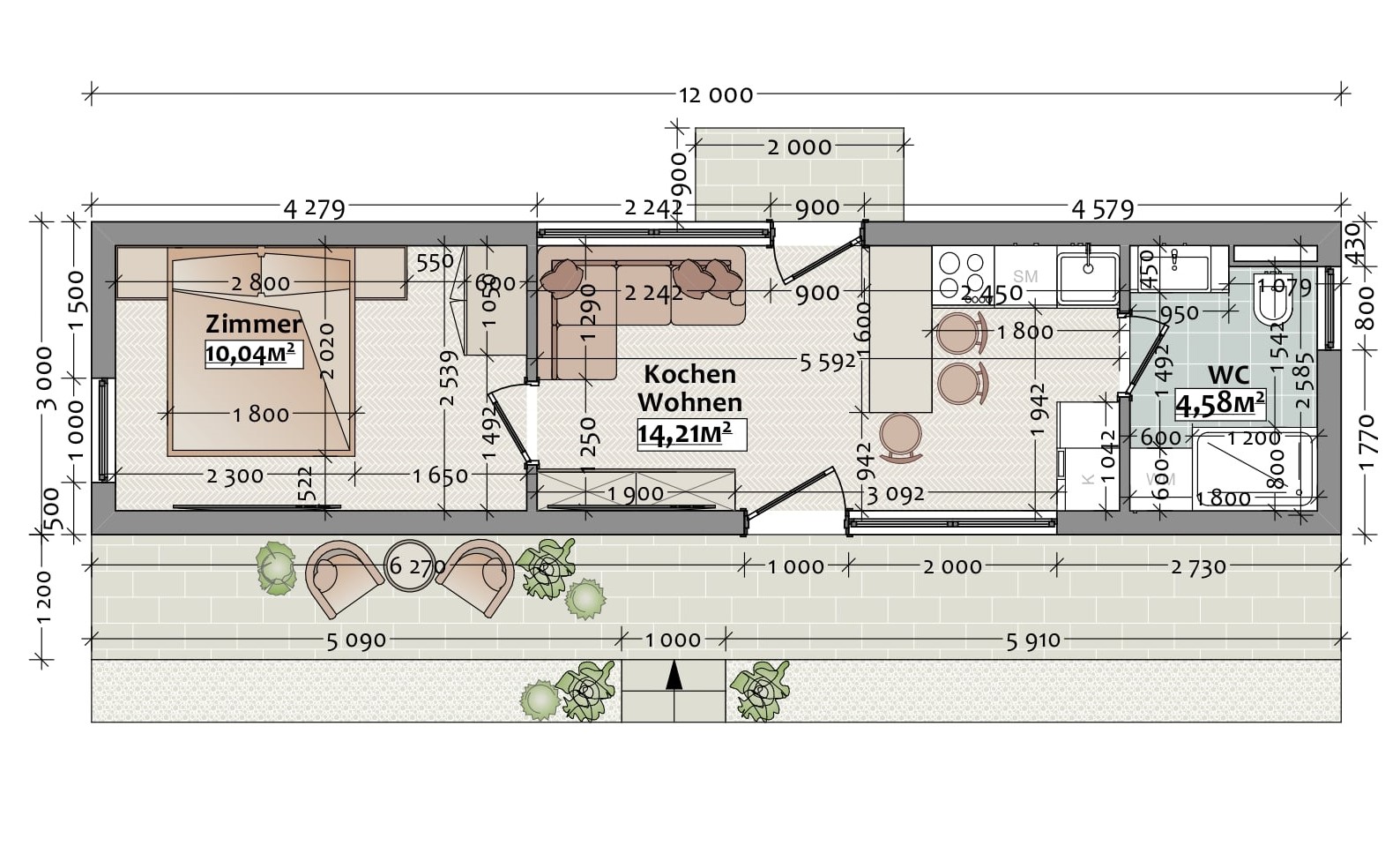 - Raumaufteilung: Geräumiges Wohnzimmer mit Küchenbereich, separates Badezimmer, gemütlicher Schlafbereich und optional eine Terrasse.