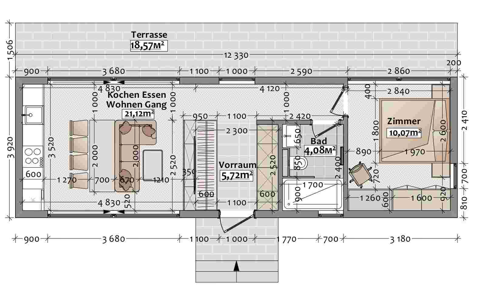 Der moderne Wohnraum ist für diejenigen gestaltet, die einen minimalistischen Lebensstil pflegen. Hergestellt aus nachhaltigen Materialien, verfügt er über eine funktionale Miniküche, einen gemütlichen Wohnbereich und ein praktisches Badezimmer. Große Fenster fluten das Innere mit natürlichem Licht und schaffen ein geräumiges und offenes Gefühl. Schnelle und problemlose Montage macht ihn zu einer idealen Wahl für kompaktes Wohnen, Gästehaus oder erholsamen Rückzugsort.