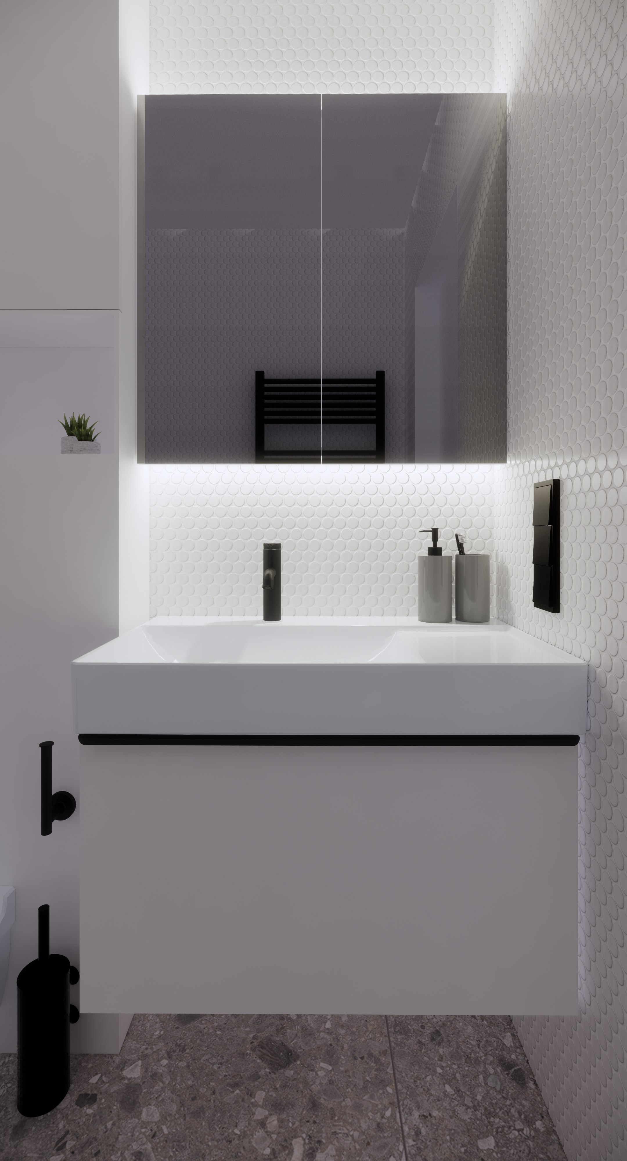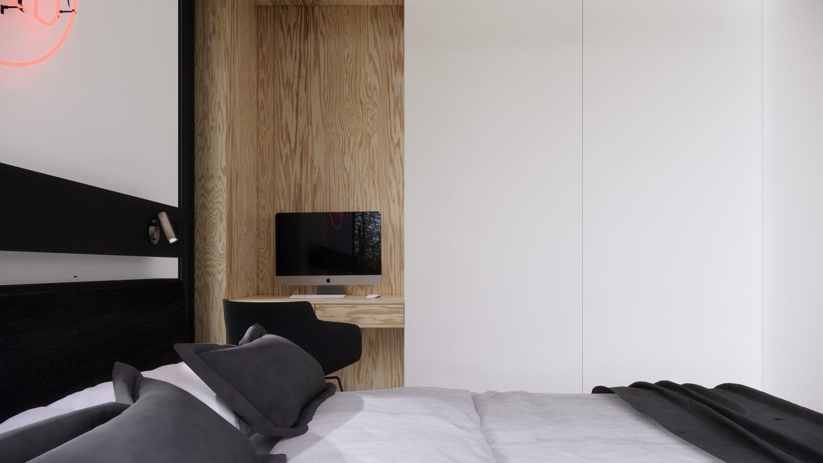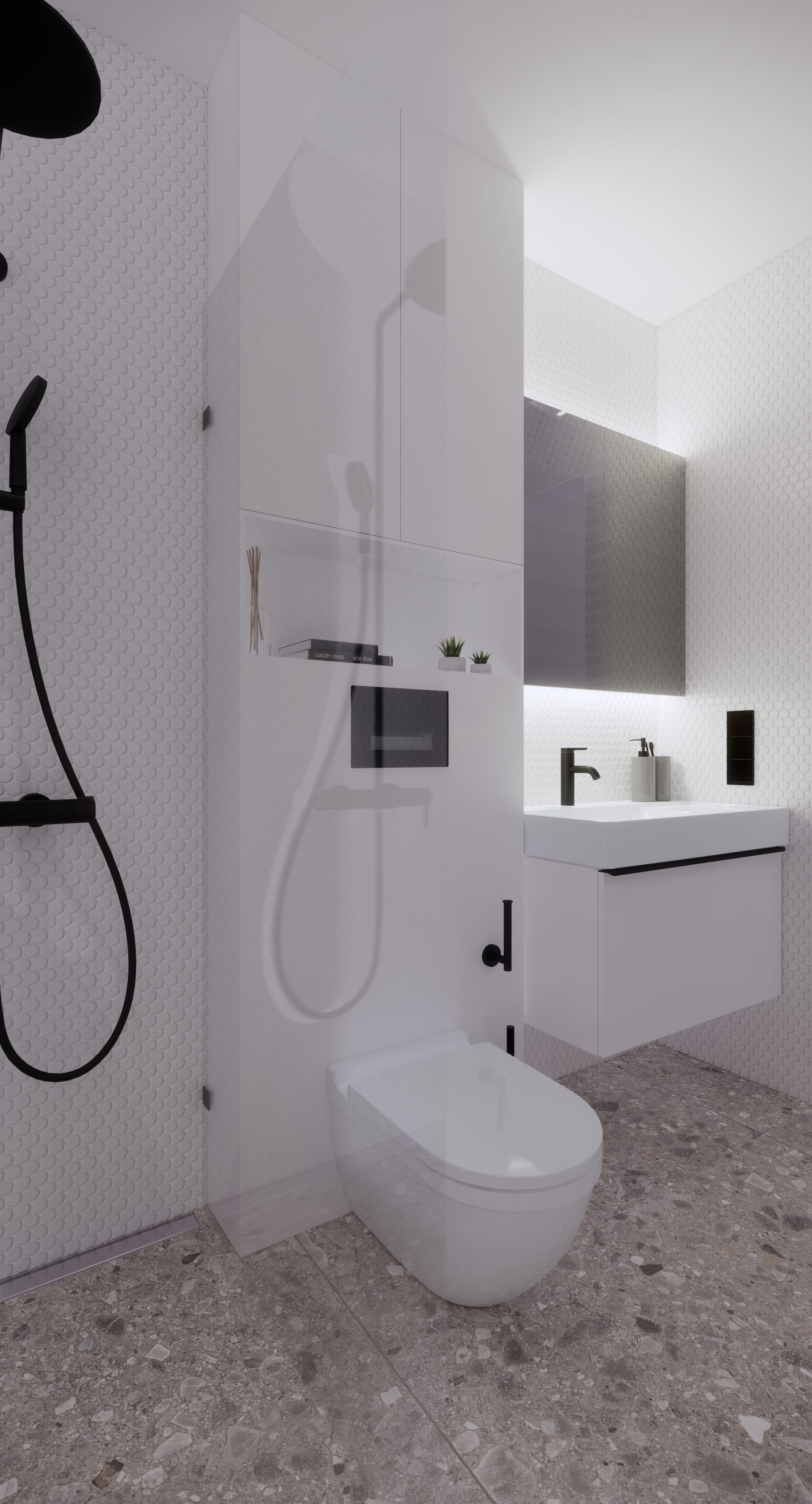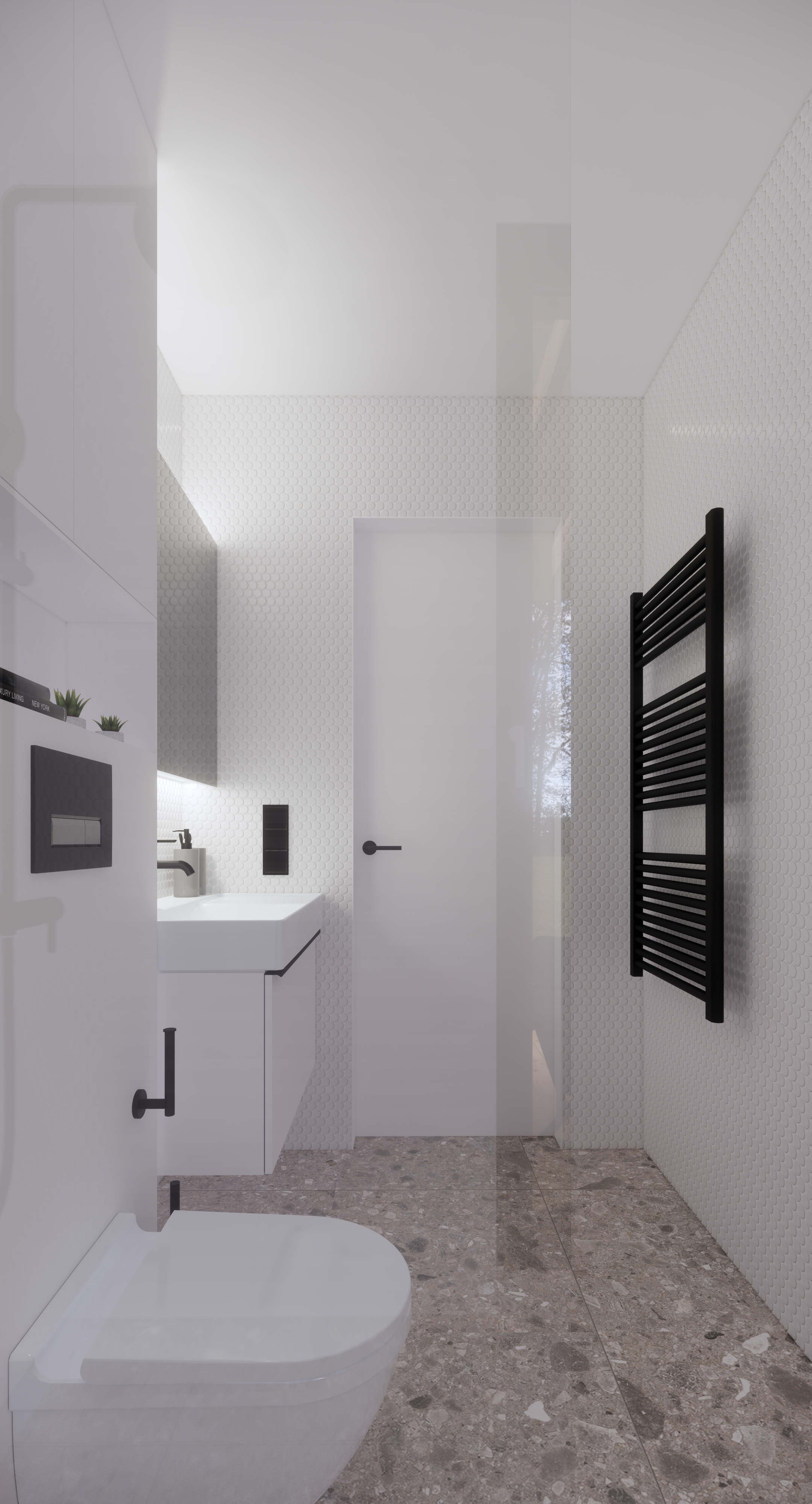 Der Grundriss umfasst einen offenen Wohnbereich mit einer geräumigen Küche und einem Wohnzimmer, die nahtlos ineinander übergehen. Große Fenster im gesamten Raum lassen viel natürliches Licht herein und schaffen eine warme und einladende Atmosphäre.