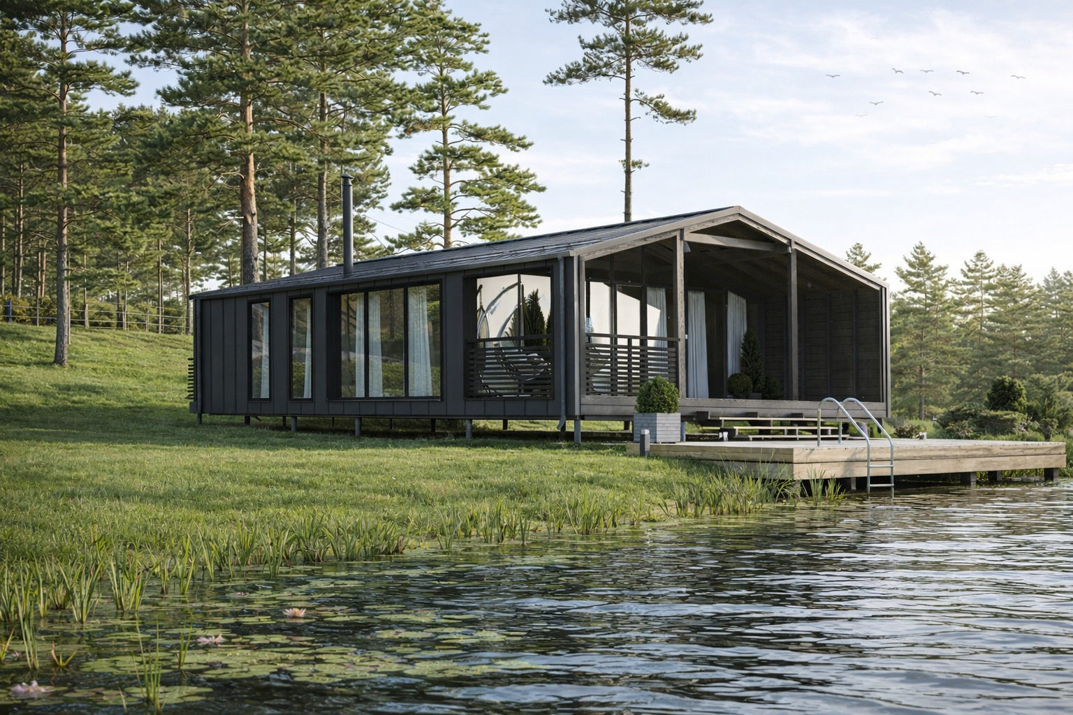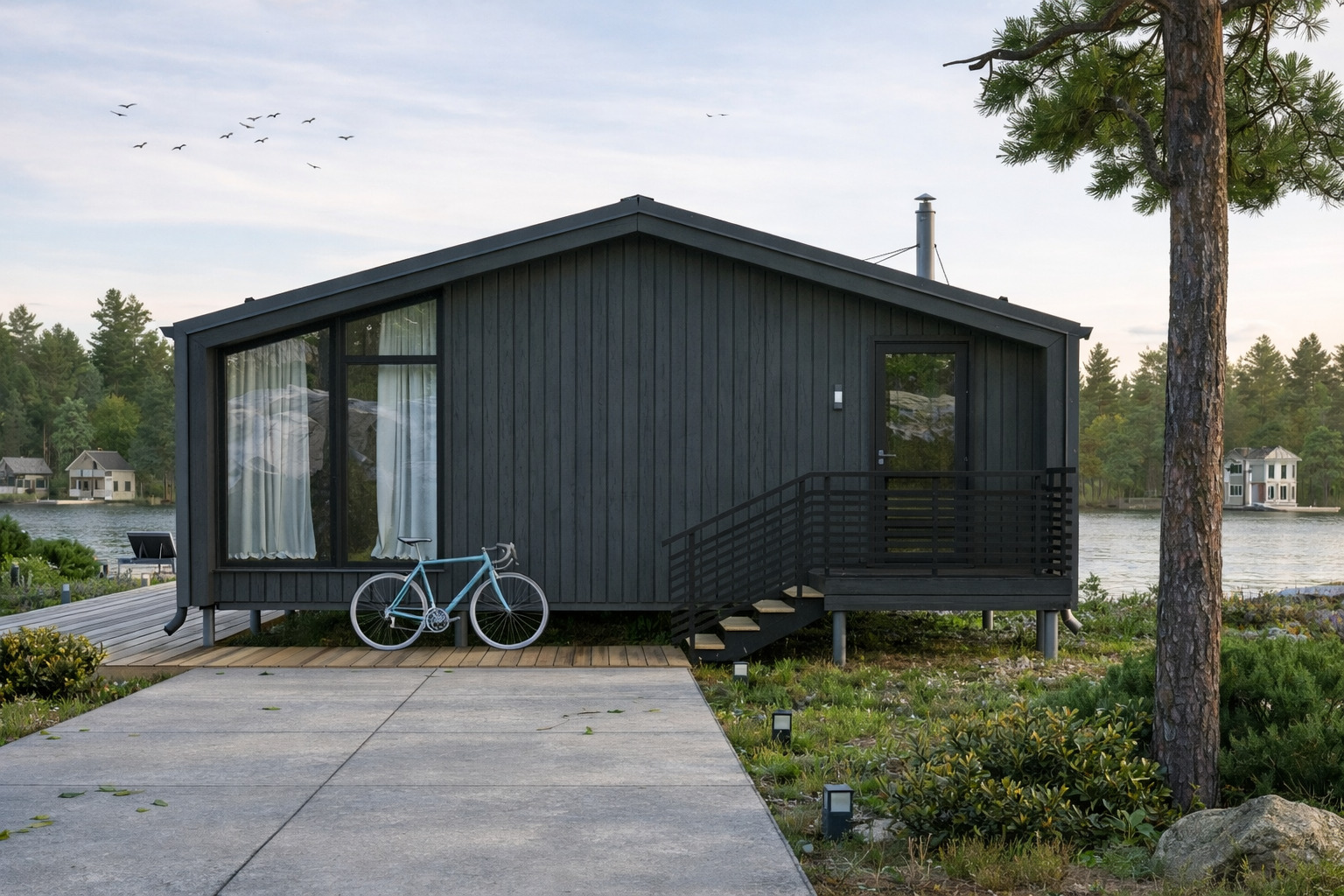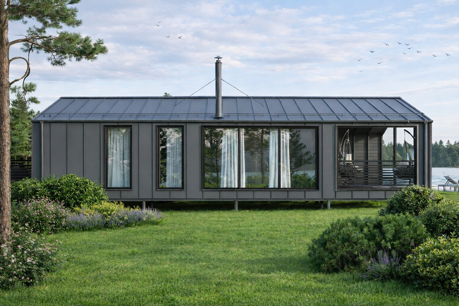 Die Fassade kann individuell gestaltet werden – aus Holz, Metall oder karbonisiertem Holz – und verleiht dem Haus eine natürliche und moderne Optik.