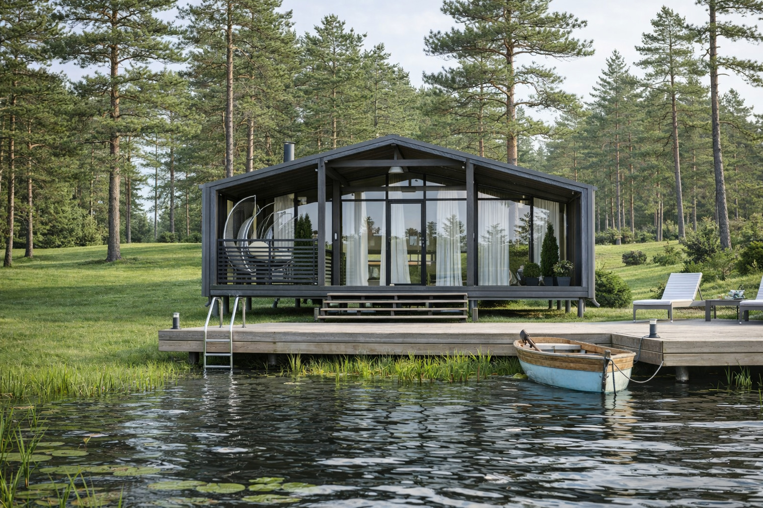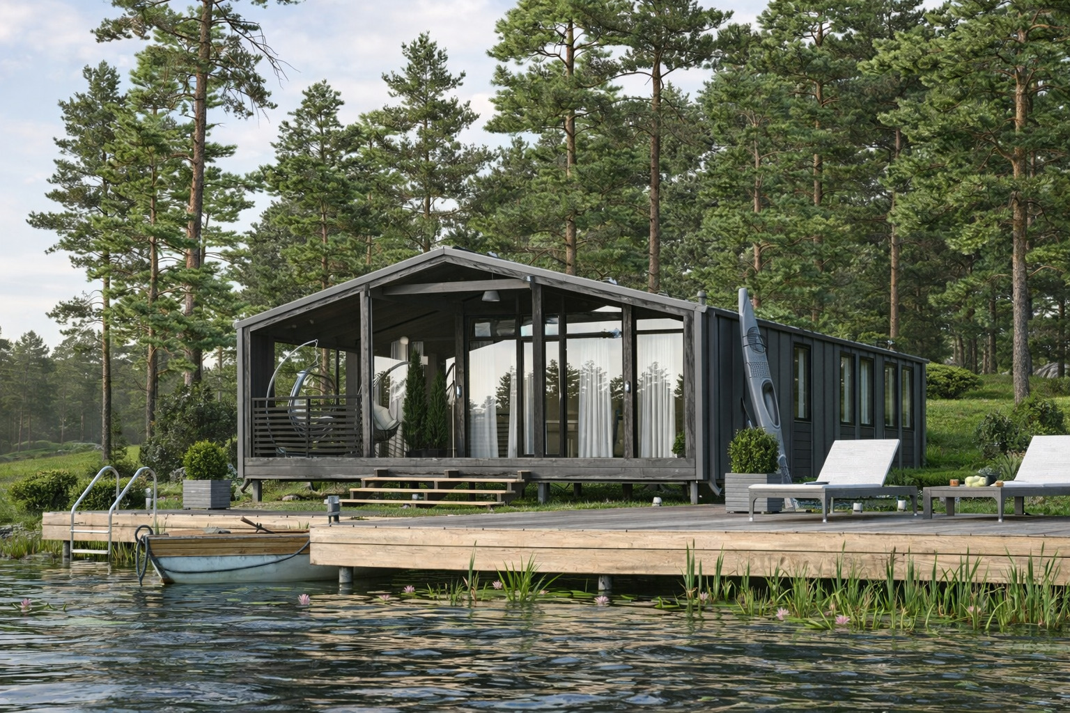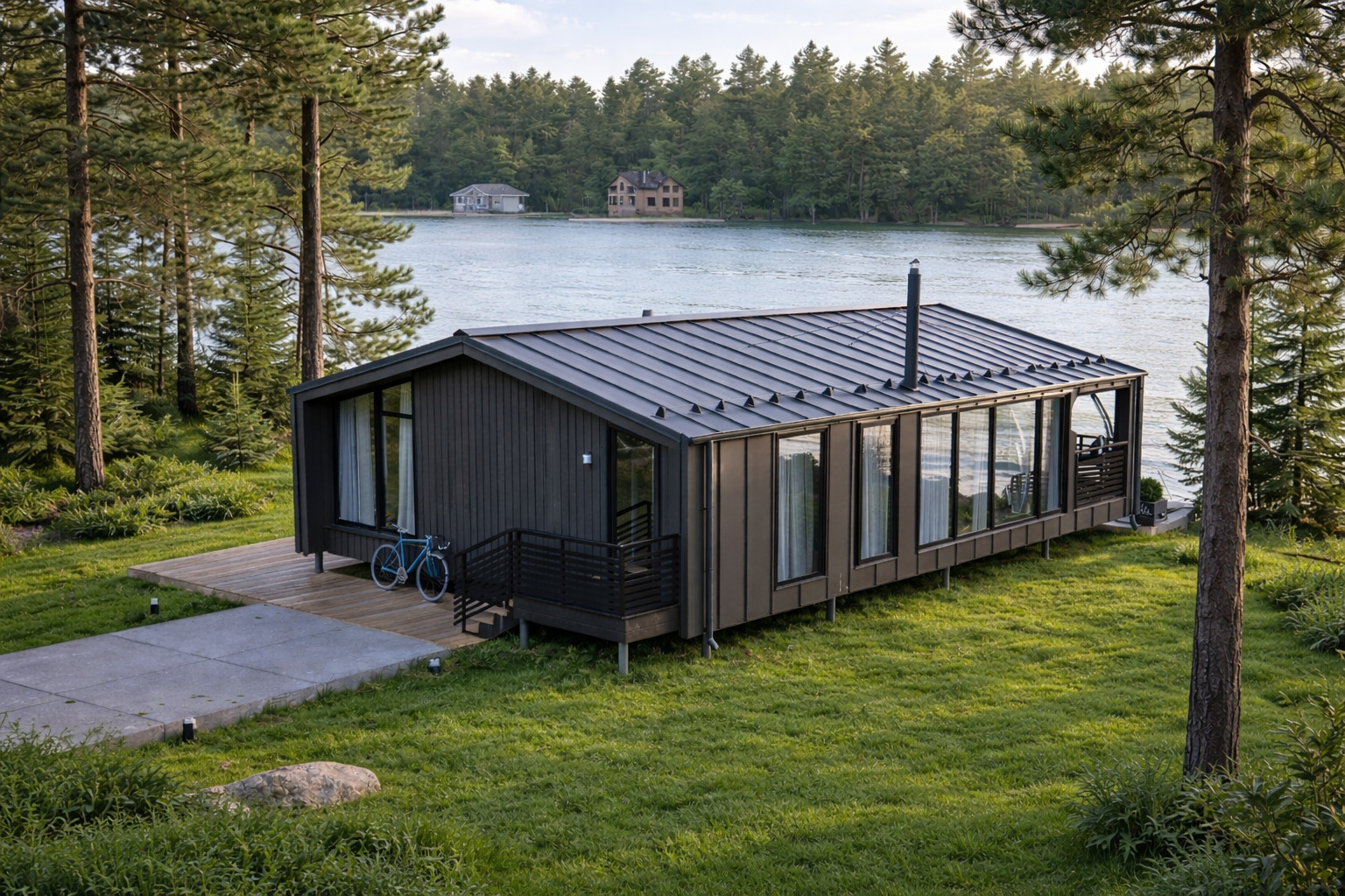 Die Fassade kann individuell gestaltet werden – aus Holz, Metall oder karbonisiertem Holz – und verleiht dem Haus eine natürliche und moderne Optik.