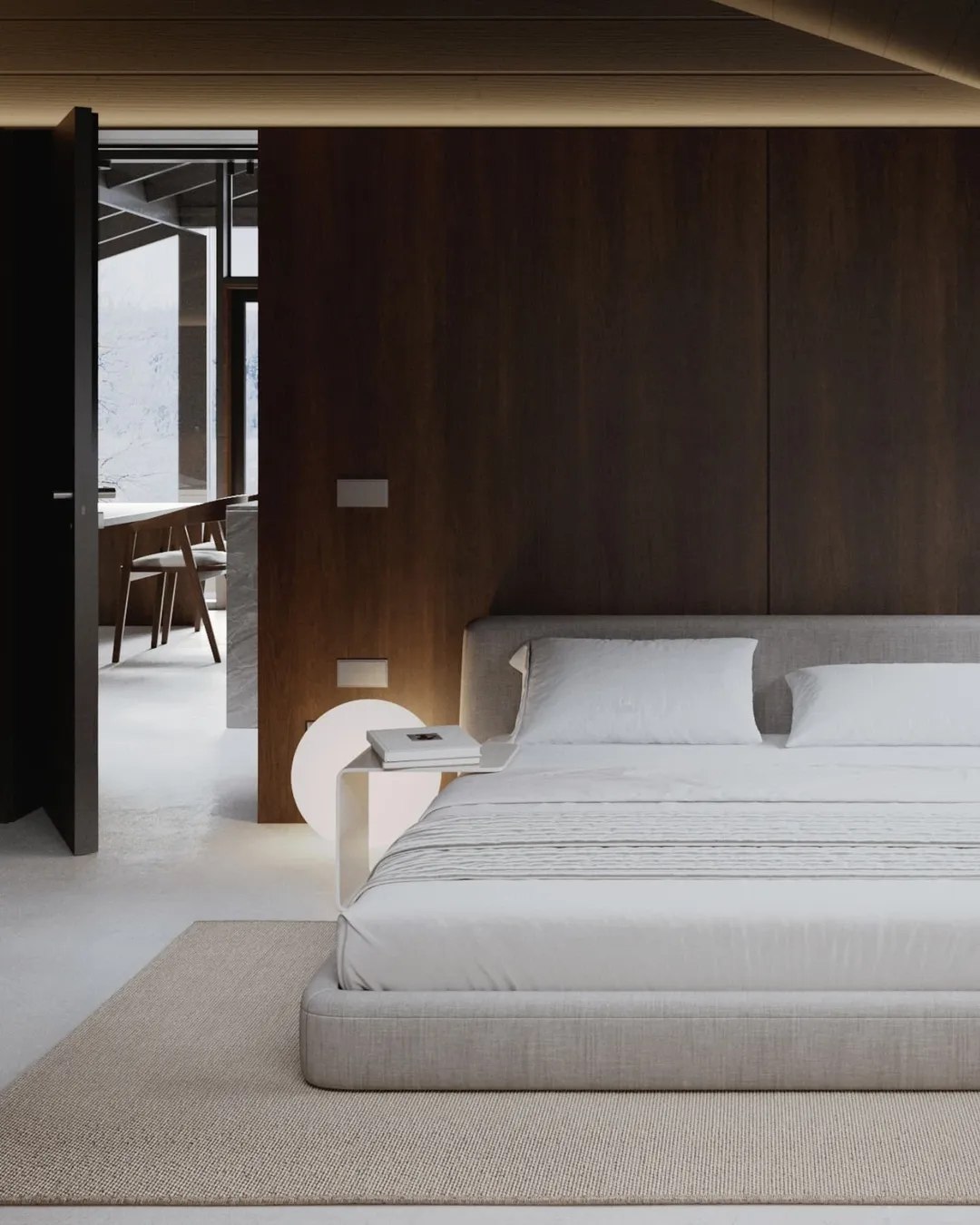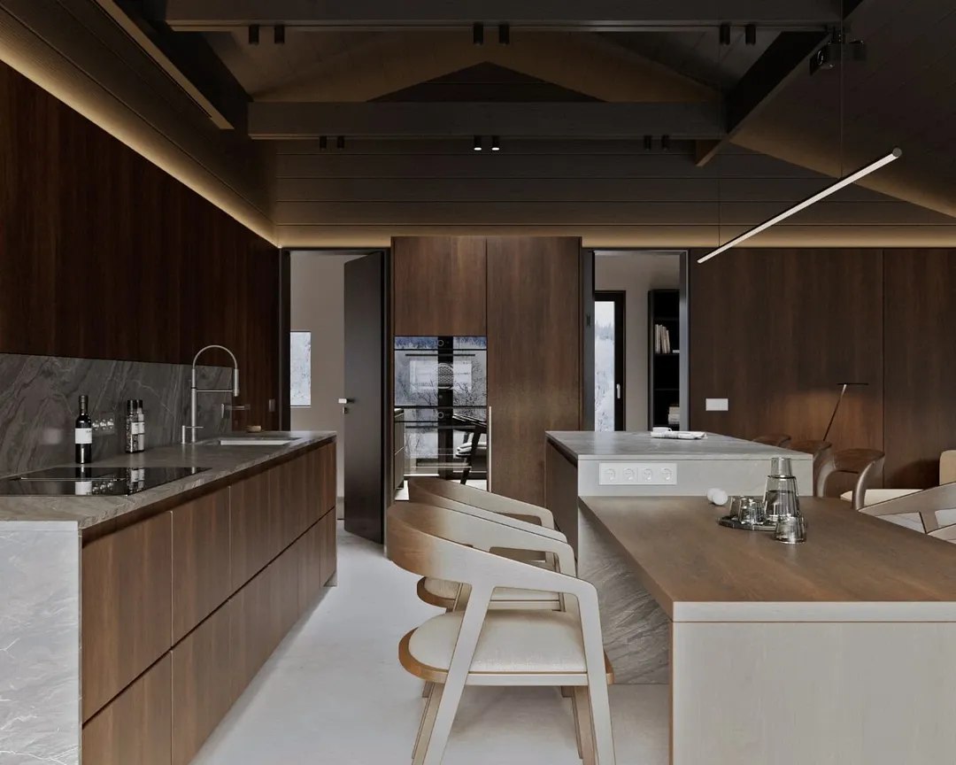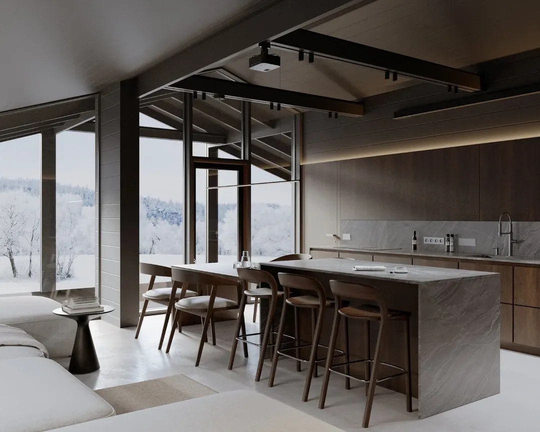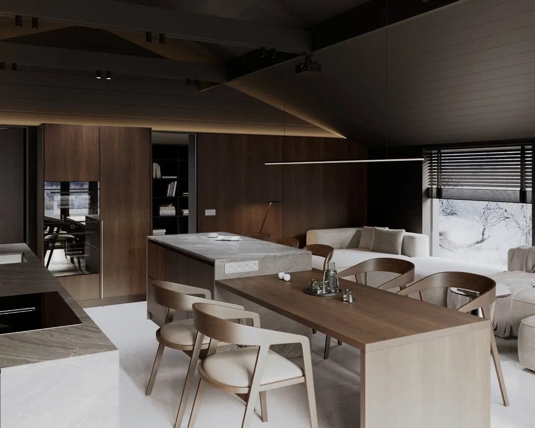Innenraum: Helle und offene Räume mit bodentiefen Fenstern (Salamander 3-fach verglast) sorgen für viel Tageslicht. Der offene Dachstuhl verleiht dem Raum ein großzügiges, luftiges Gefühl.