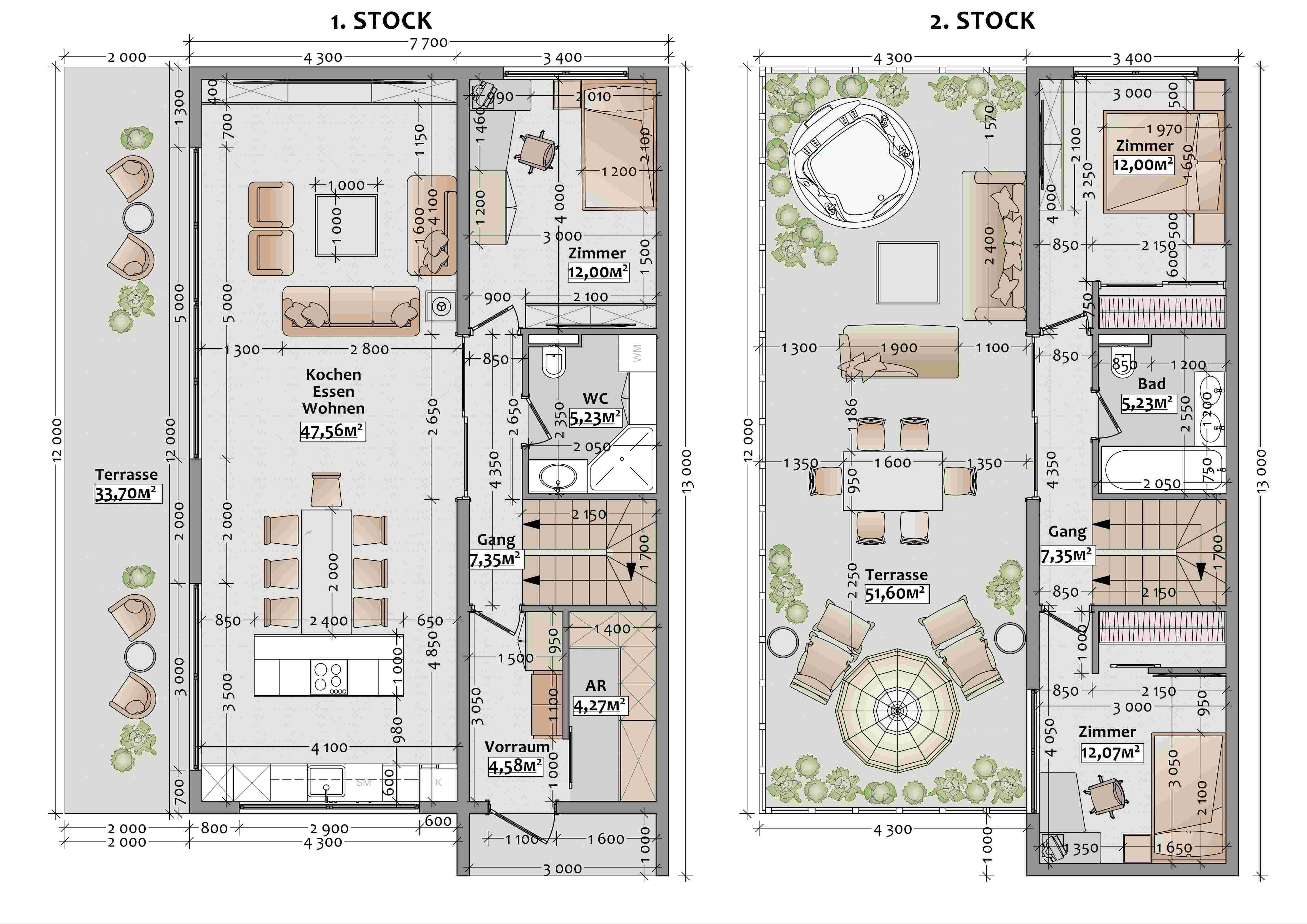 - Im Obergeschoss befinden sich zwei Schlafzimmer, ein Badezimmer und der Zugang zur Dachterrasse, die als Entspannungsbereich gestaltet werden kann.
